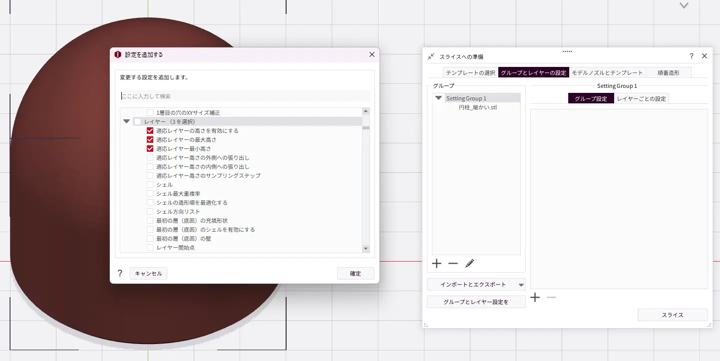 グループとレイヤーの設定をクリアせず、違うモデルをインポートし、「グループやレイヤーの設定は、選択したメインテンプレートのスライス設定を上書きします。続行しますか?」のメッセージが出た際に、「はい」を押してしまうと前回使用したグループとレイヤーの設定が違うモデルに対しても反映されています。