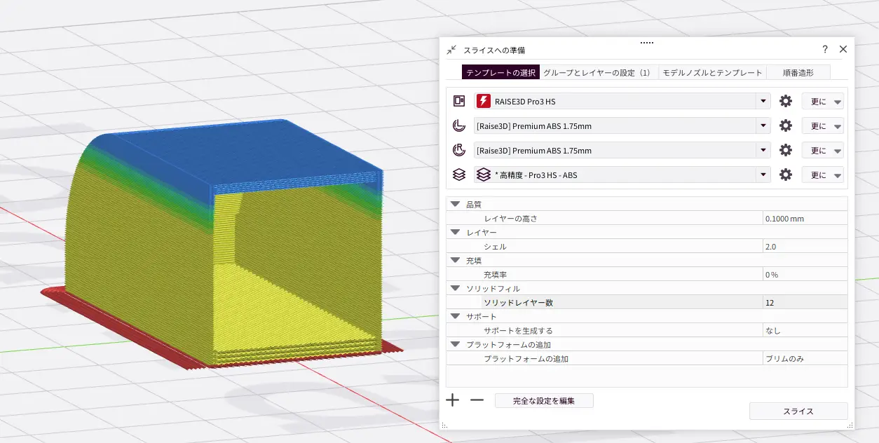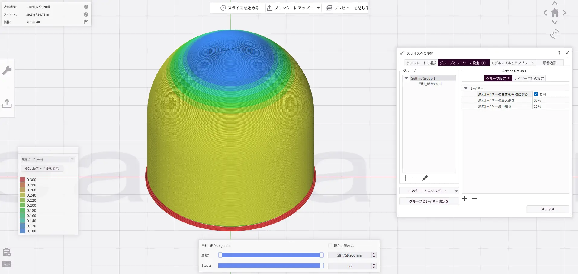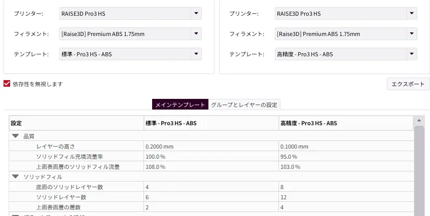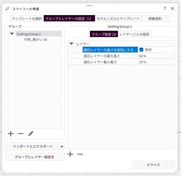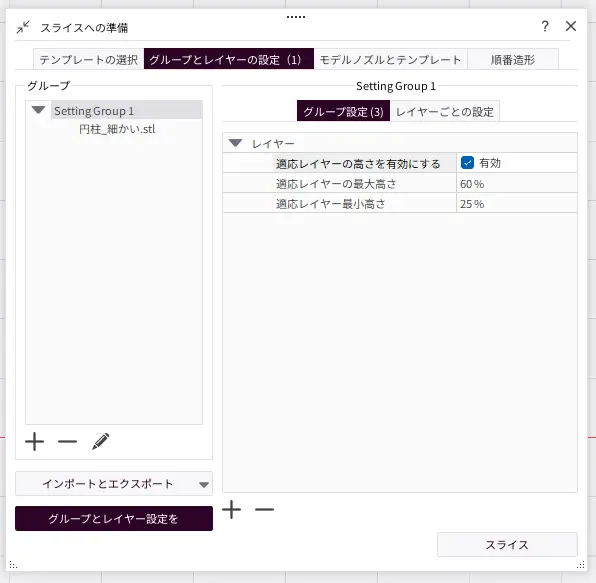 グループ設定で個別に設定することも可能ですが、複数の積層ピッチが混在する状態での造形は推奨しません。