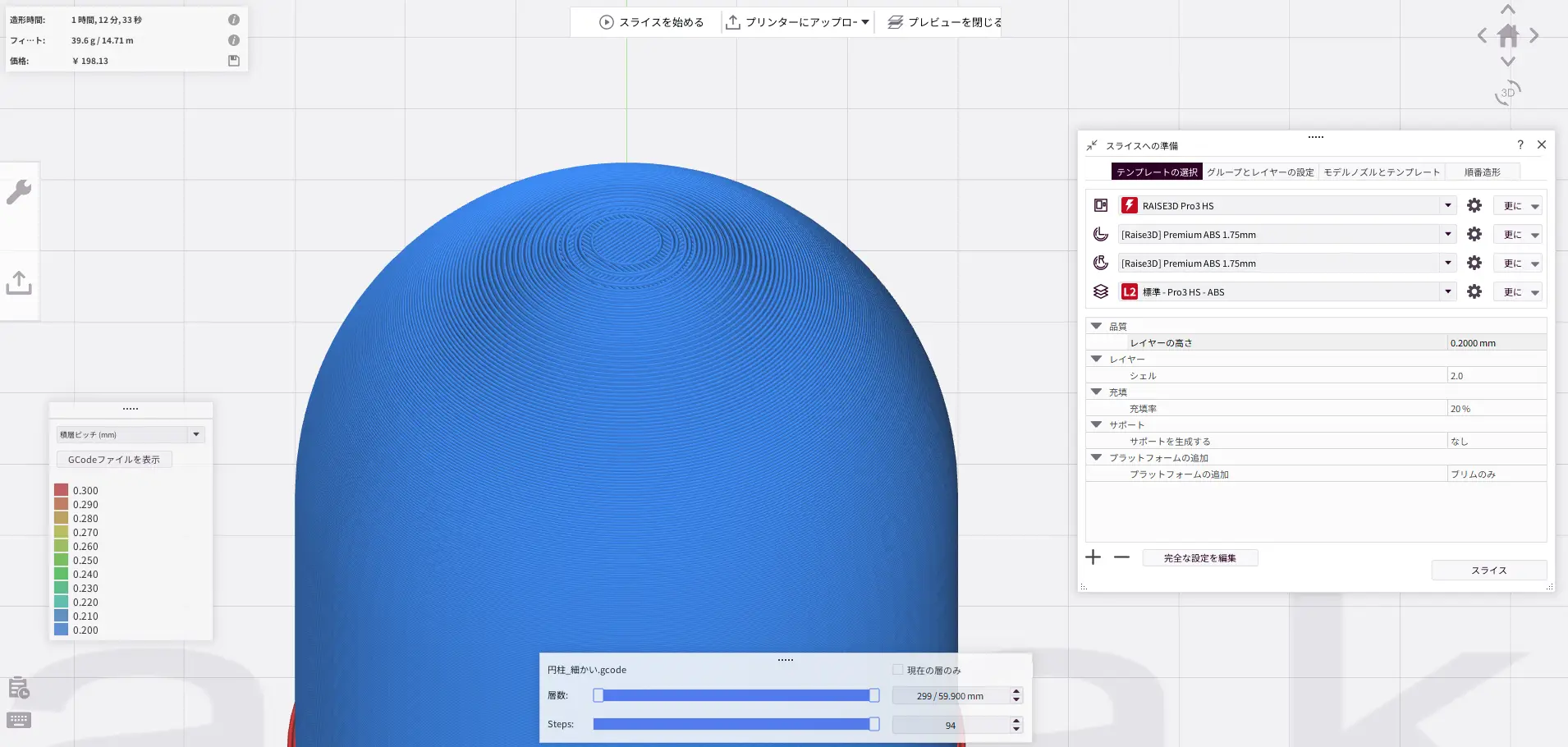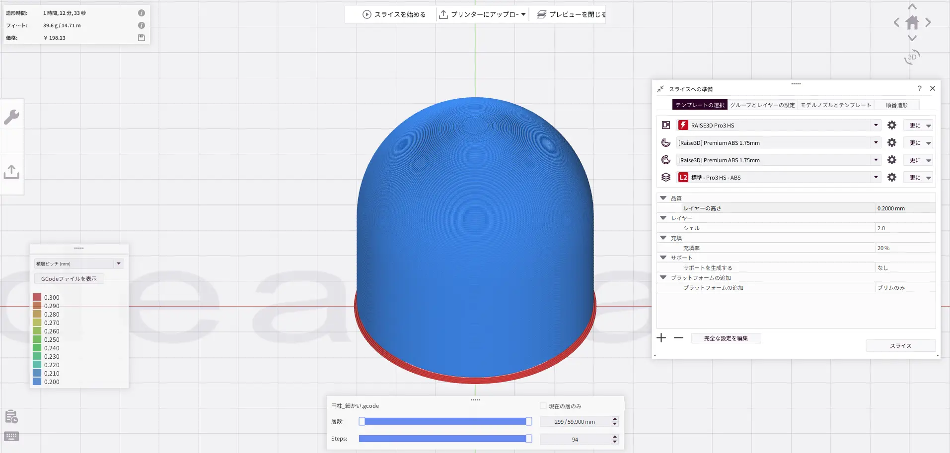 今回用意したモデルのように、円筒形状と半球形状が合わさったようなモデルの場合、積層ピッチが荒いと半球形状の積層痕が目立ち、積層ピッチを細かくすると半球形状は綺麗に作れるものの、造形時間が大幅に伸びてしまいます。