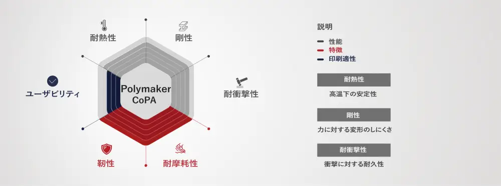 180℃の耐熱性(ビカット軟化温度) / 耐摩耗性 / 耐疲労性 / 潤滑性 / 強靭性 / 低反り