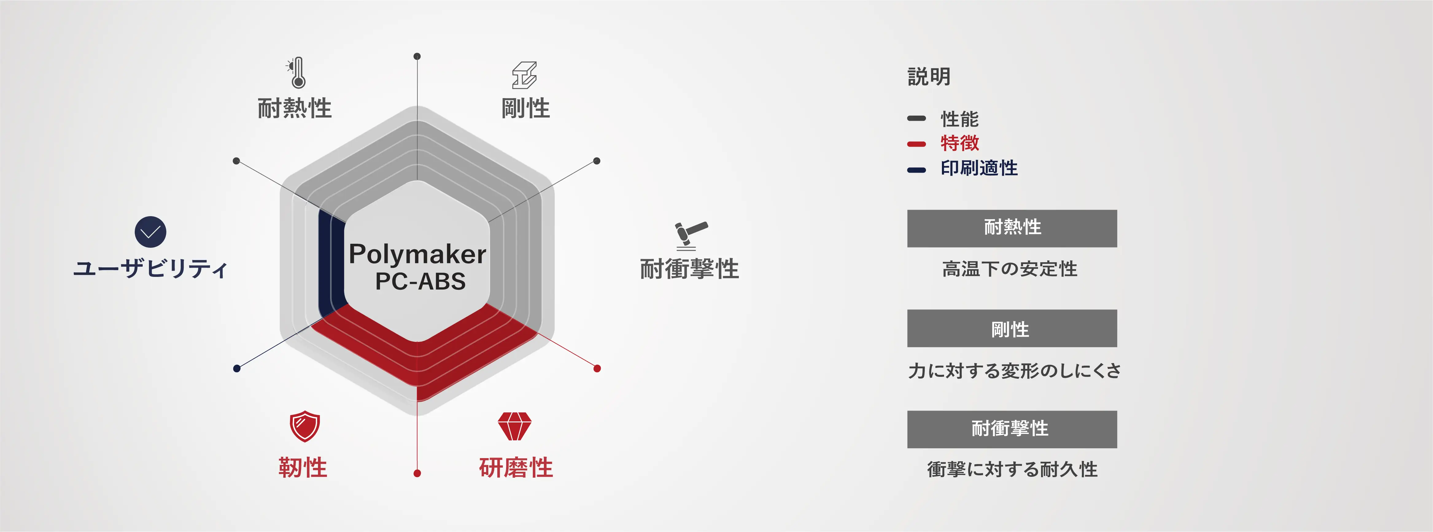 耐衝撃性 / 靭性 / 耐熱性 / 透明性 / 耐薬品性